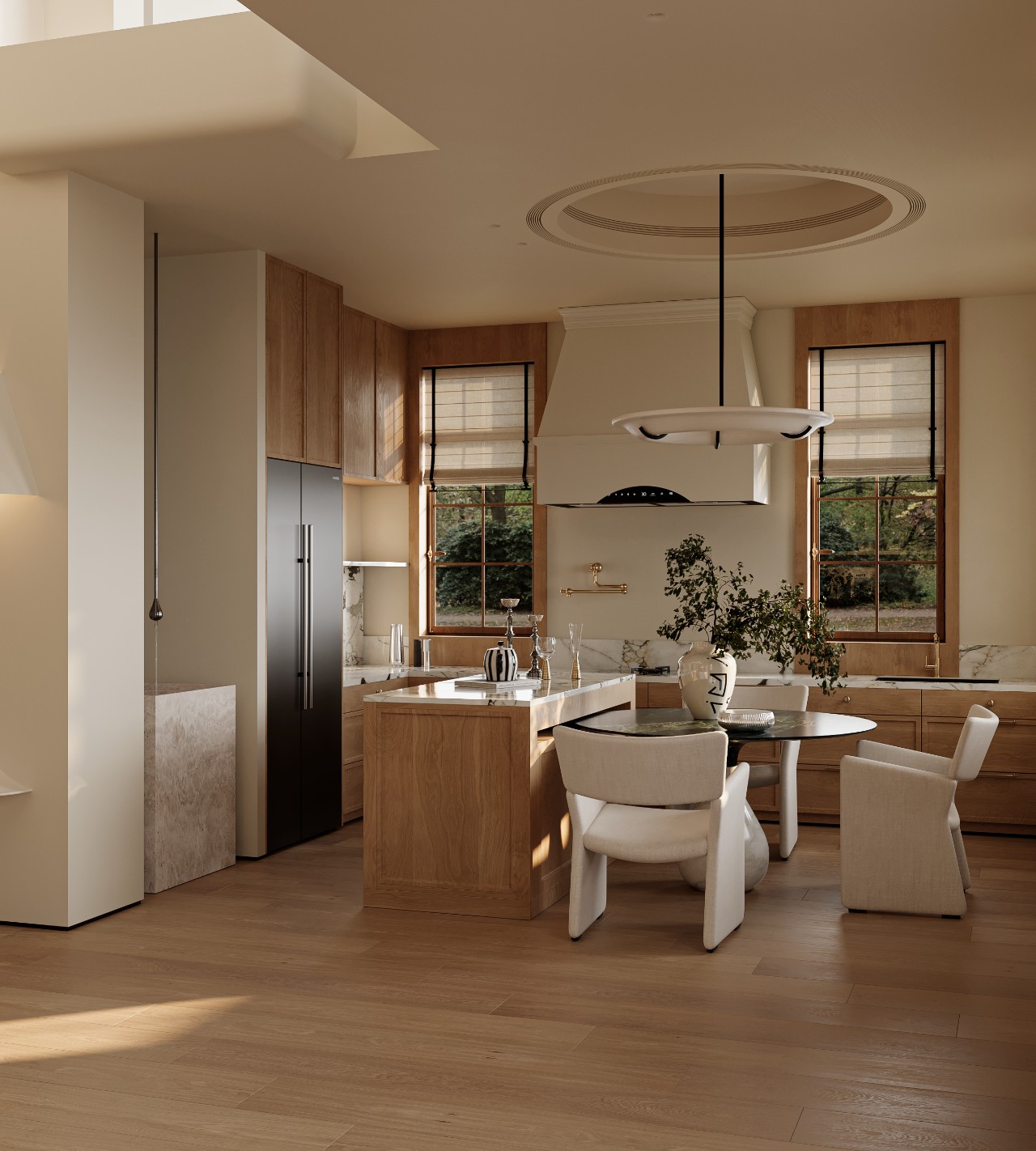 公共区域在材质组合和色彩比例的拿捏上巧妙而精准,空间通透轻盈,绵延出自然舒适的氛围,不着痕迹地调节着观者的心境。