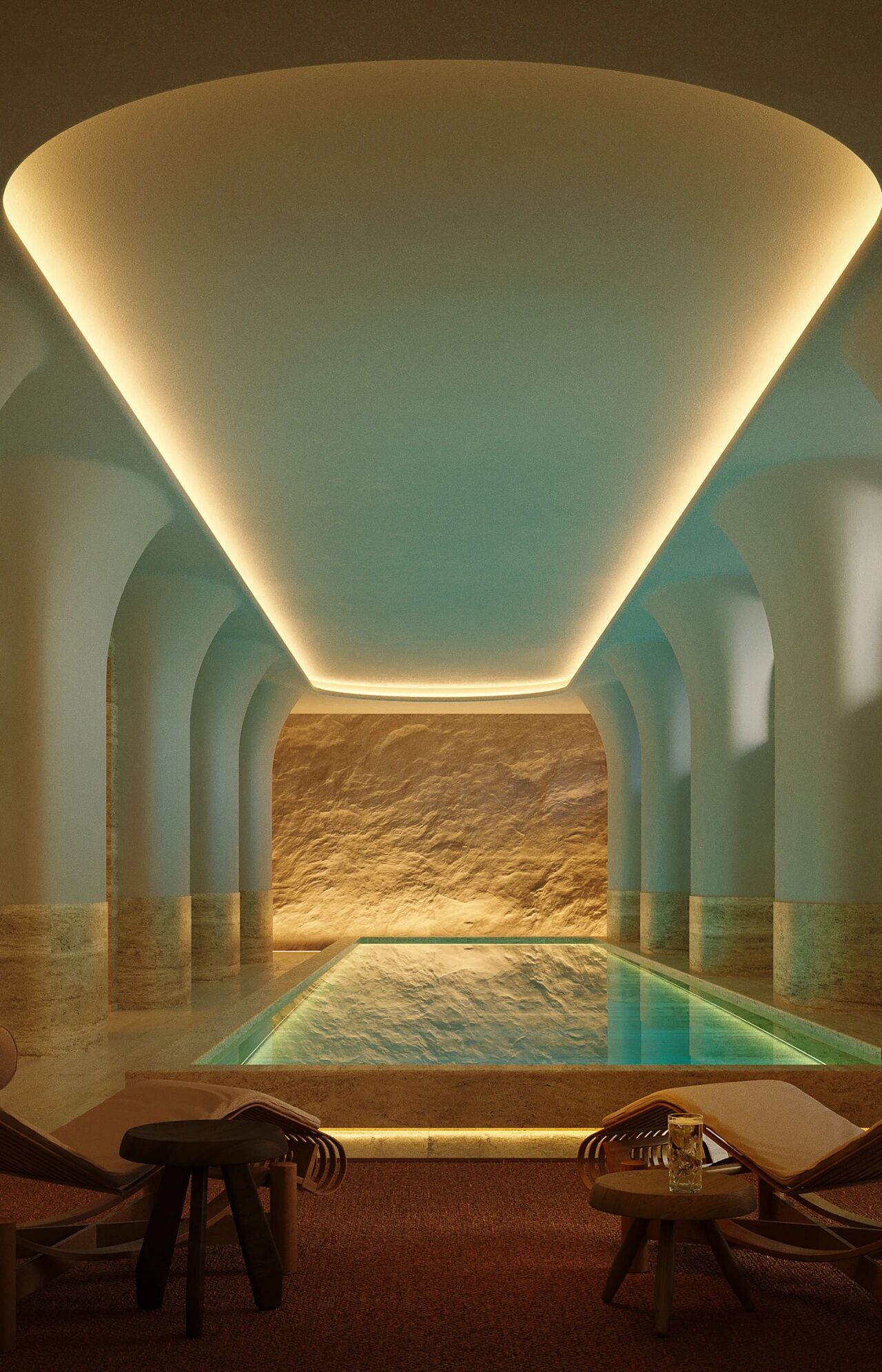 私人公寓有家庭卧室和浴室。它低矮的屋顶和深色的饰面使它在视觉上与公共机翼区别开来,并暗示着亲密。一个儿童游乐阁楼藏在大房间的屋檐下,那里的建筑物是相交的。私人露台位于主卧室外。