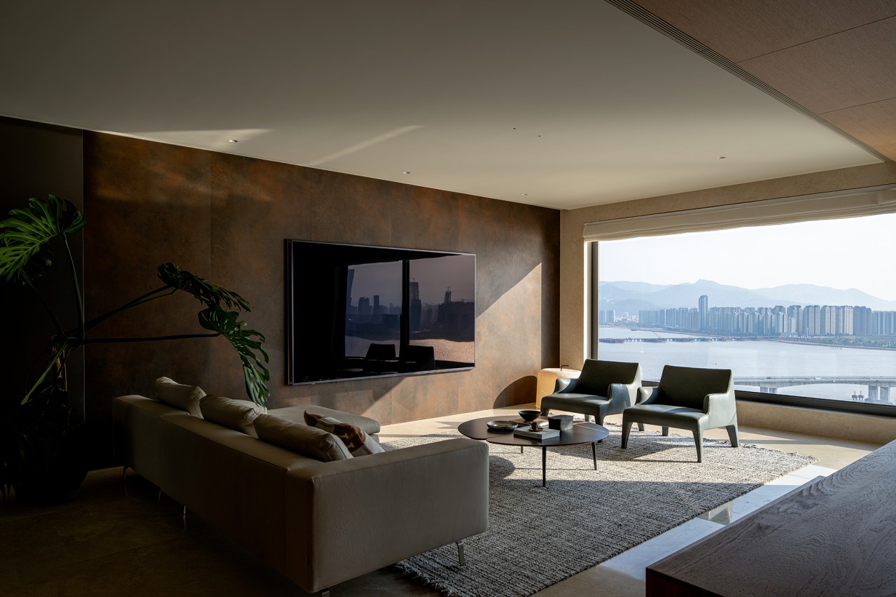 落地窗位置加入竹子,营造都市中的淡淡竹意,增加自然的活力。射灯从下往上,竹叶的光影映在天花上,呈现出奇妙的艺术效果。