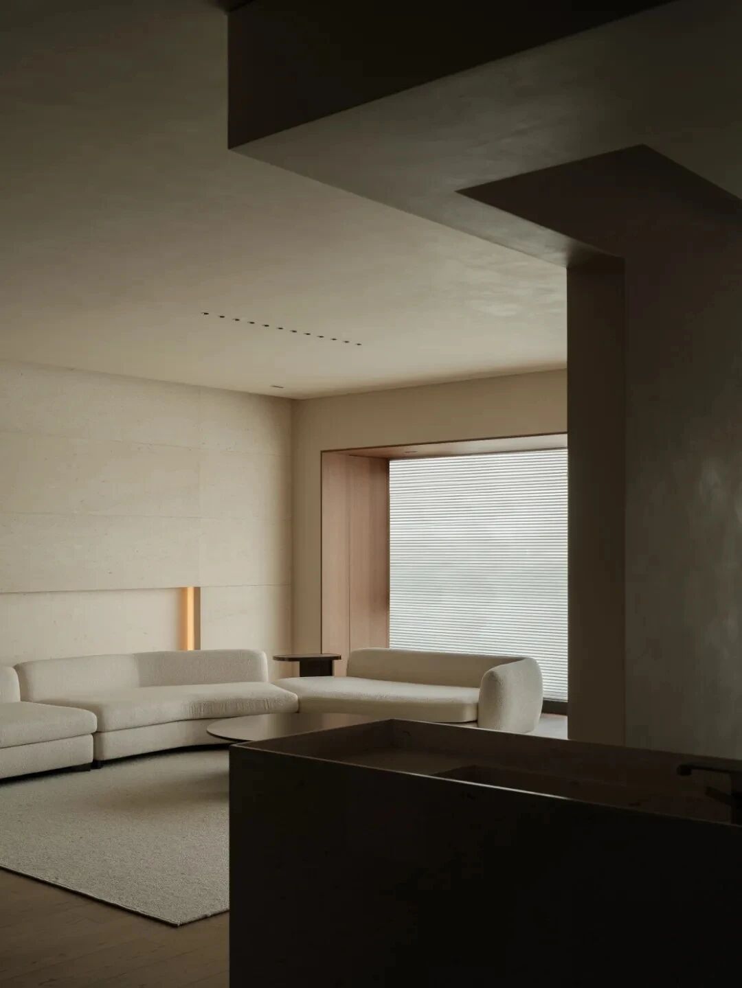 门厅留设一扇弧形玻璃窗可望向庭院,一株青木静立水面,天光云影融入此间,人踱步于自然与艺术的交融自洽之中,可感其间散逸的灵气与洗练的精神。