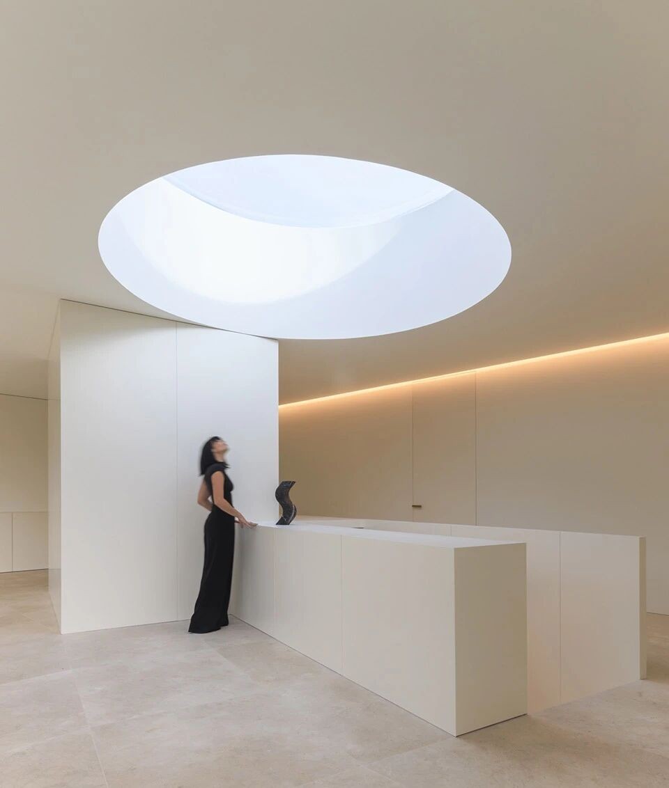 太阳强烈,水波温柔,穿过一片水景进入接待区。光洁的建筑立面与舞蹈式的光影,倒映在羊驼脚下的地面,折射成一片浪漫之色,真实生灵物像与稍纵即逝的光影相互交织,情绪在不同的维度间跳跃。