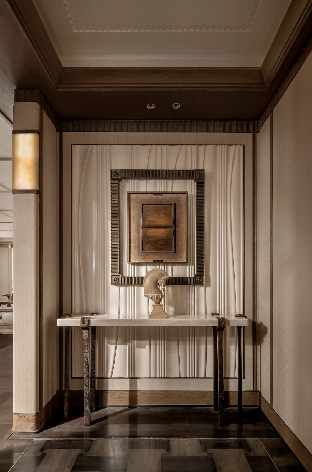 为了与建筑的未来感保持一致风格,室内部分家具选择异形造型,以确保建筑和室内设计之间保持平衡。少量墨绿色低调的点缀处理,与自然景观相呼应。这种相得益彰的默契,最终共同营造出科华北辰天璞艺术中心简约淡雅的气质。陈设设计为空间注入生活的艺术,让人们从喧嚣尘世中抽身片刻,感受静谧,休憩身心。