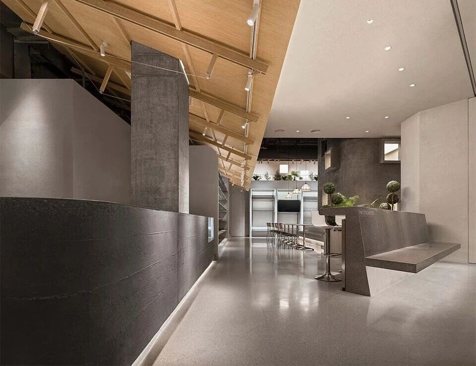 天花板设计通过改变密度、高度和大小,能够转换天花板面板的透明度,当你穿过它时,创造一种空间的深度感。设计元素延伸到外立面在入口被拉起,并沿着天花板连接,提供外部和内部信封间的连续性。