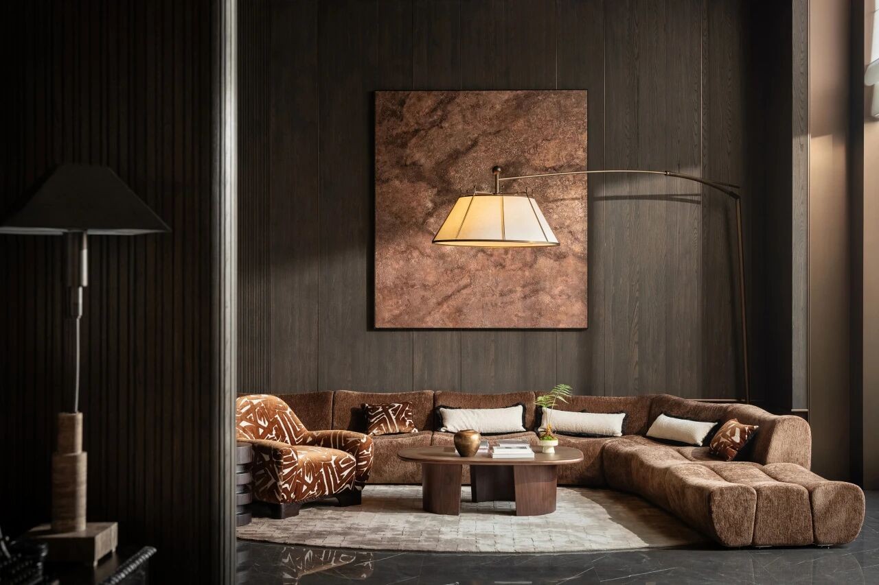 在私密的灯光下,空间的地板上覆盖着 Boulevard 系列,这让地板看起来像是被打过的泥土。在这个以泥土为主的调色板中,单色与代表天空和水的 Aqua 陶瓷的蓝色分开。