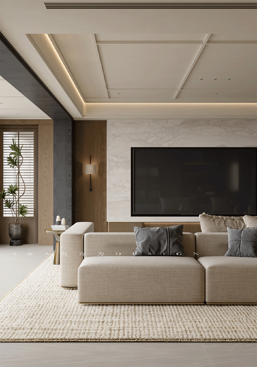 玄关处,散布在角落的艺术品与绿植,都将细节之处点缀出生活的质感。