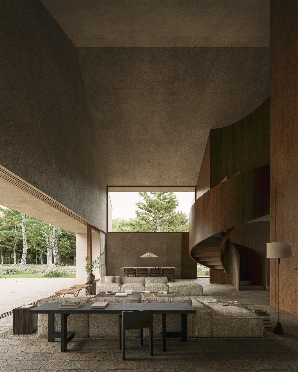 基于业主的职业偏好,在设计室内空间时,设计师以弧线作为线索,将来自大坝结构上的考量以材质和形式元素进行空间上的转译,充满雕塑感的建筑体量产生了强烈的叙事性,使得整个空间产生了一种复古及怀旧的围合感,一些来自自然与内心的坚定力量在建筑构造中自由生长。
