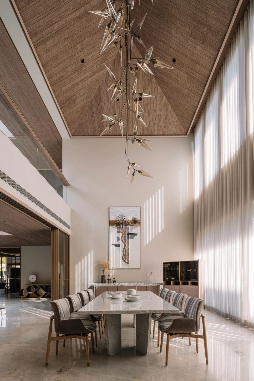 以清水混凝土、镜面不锈钢、碳化杉木来构建结构的主要形态,凭借镜面反射形成交错繁复的空间质感,凌厉的几何线条并没有带来冷硬拒绝的态度,而是引人置身瑰丽的幻境。