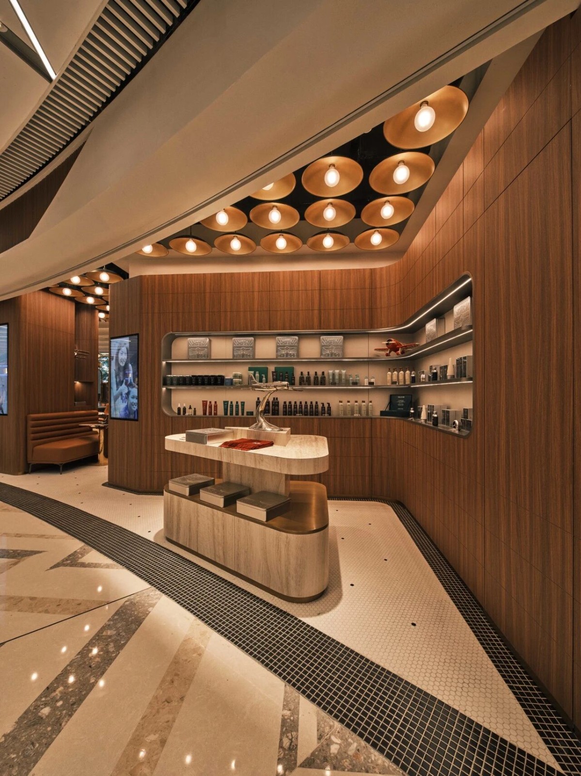 “弱之胜强,柔之胜刚”,入户顶部流动的曲线,像是湖岸线,又像是水流的轨迹,圆形顶像是湖面荡开的涟漪,以柔软的、动态的形式,营造出富有张力和戏剧性的空间,而在这灵动中传递出一种静谧感。