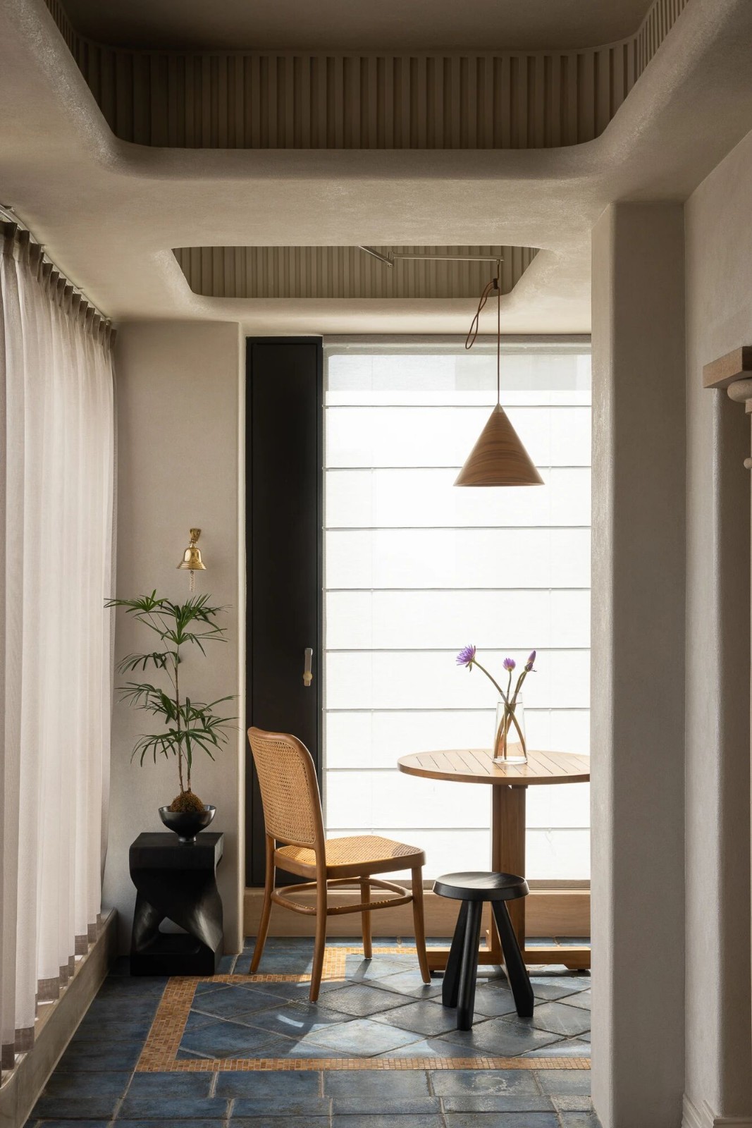 是一处推广健康生活方式的空间,客人可以在这里享受悠闲的生活,专注于身体的恢复。其一楼配置了基于“身体和心灵平衡”的瑜伽、普拉提以及社区休息室和展览空间;二楼设置了冥想室和需要提前预订的茶室。茶室的入口使用了光滑的拱门,塑造一种关注空间本身的感官体验。