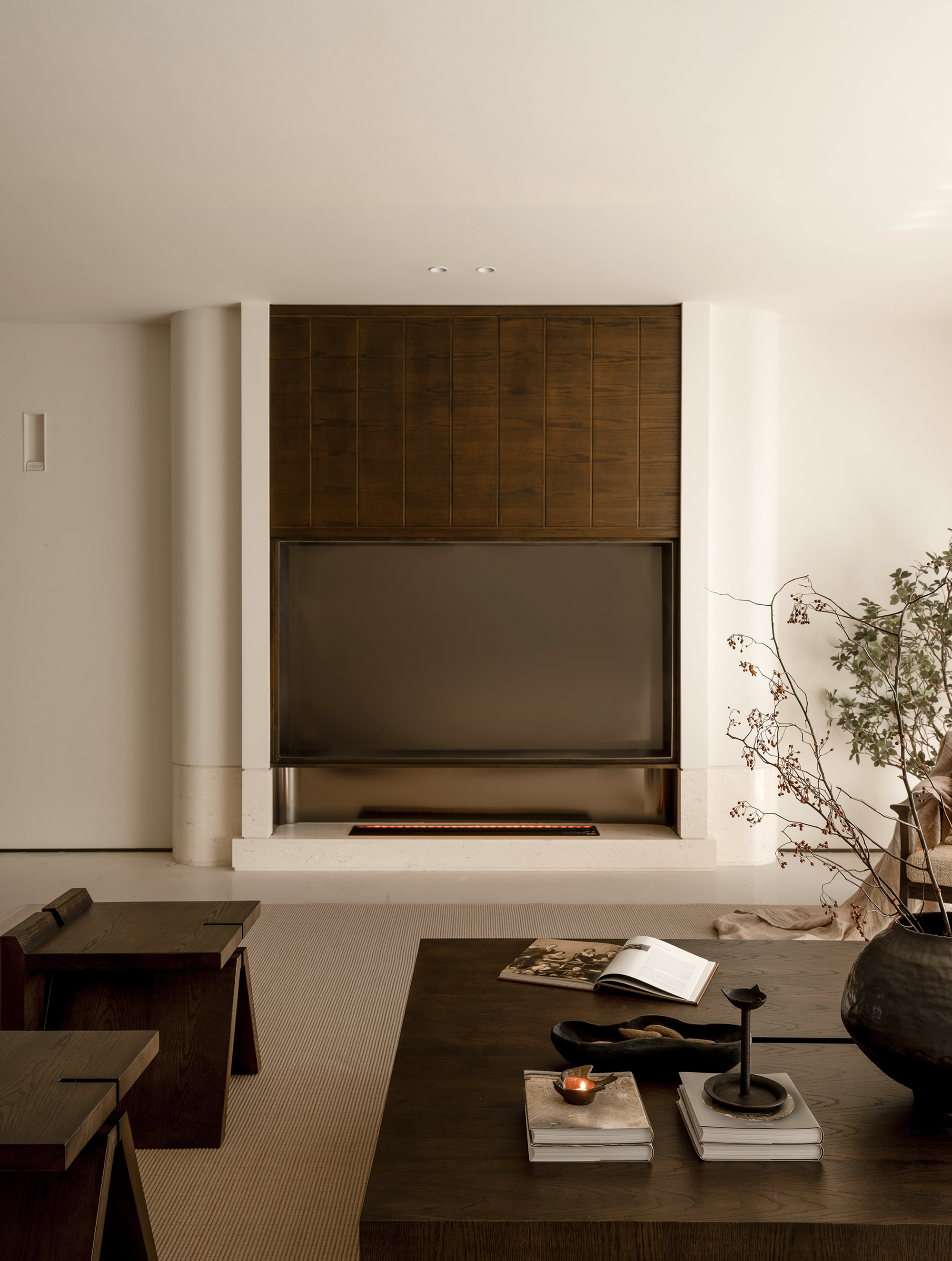 David Fewson sourced a unique collection of tiles, furniture and accessories to give its occupants an immersive sensory experience. Soft drapery from ceiling to floor sets off the natural scenery outside the glass window, softening the tough barbarism style of the building; The exquisite collection of furniture evokes a subtle medieval atmosphere.