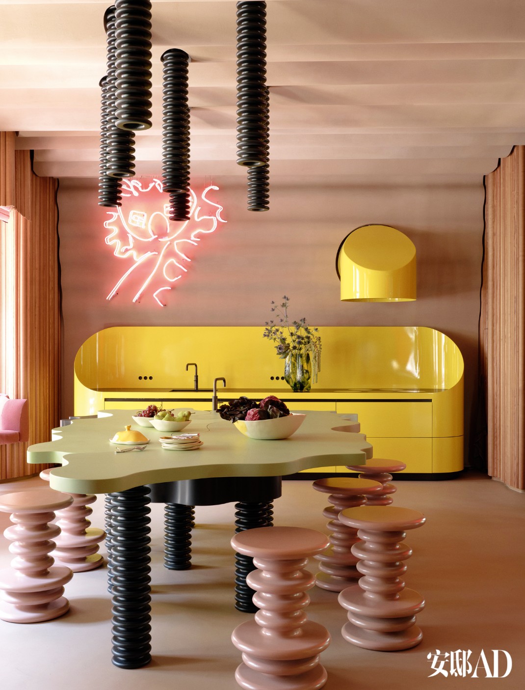 设计师以包豪斯风格为载体,将过去的经典与现代元素相结合,用中古木色做基底,孟菲斯元素做点缀,用多巴胺色彩去融合各种材质,形体与软装,让空间既有对比冲突又相互和谐统一,最终呈现了一个复古多元又充满活力的空间。