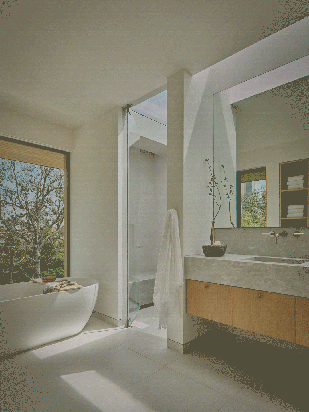 This apartment reconstructs the relationship between nature and living with minimalist architectural language. The suspended garden surrounded by glass on three sides becomes the focus of the space - moss and plants are frozen in a crystallized state, transforming organic life into a spatial sculpture. This restrained design philosophy runs through the whole design: the core block of the wood and stone structure divides the functional areas and forms a visual rhythm, and the hidden storage and seamless floor continue the pure sense of space. The material selection highlights the thoughtful subtraction, and the neutral tone composed of painted oak, travertine and matte white creates a low-key luxury through the touch and light interpretation of leather details.