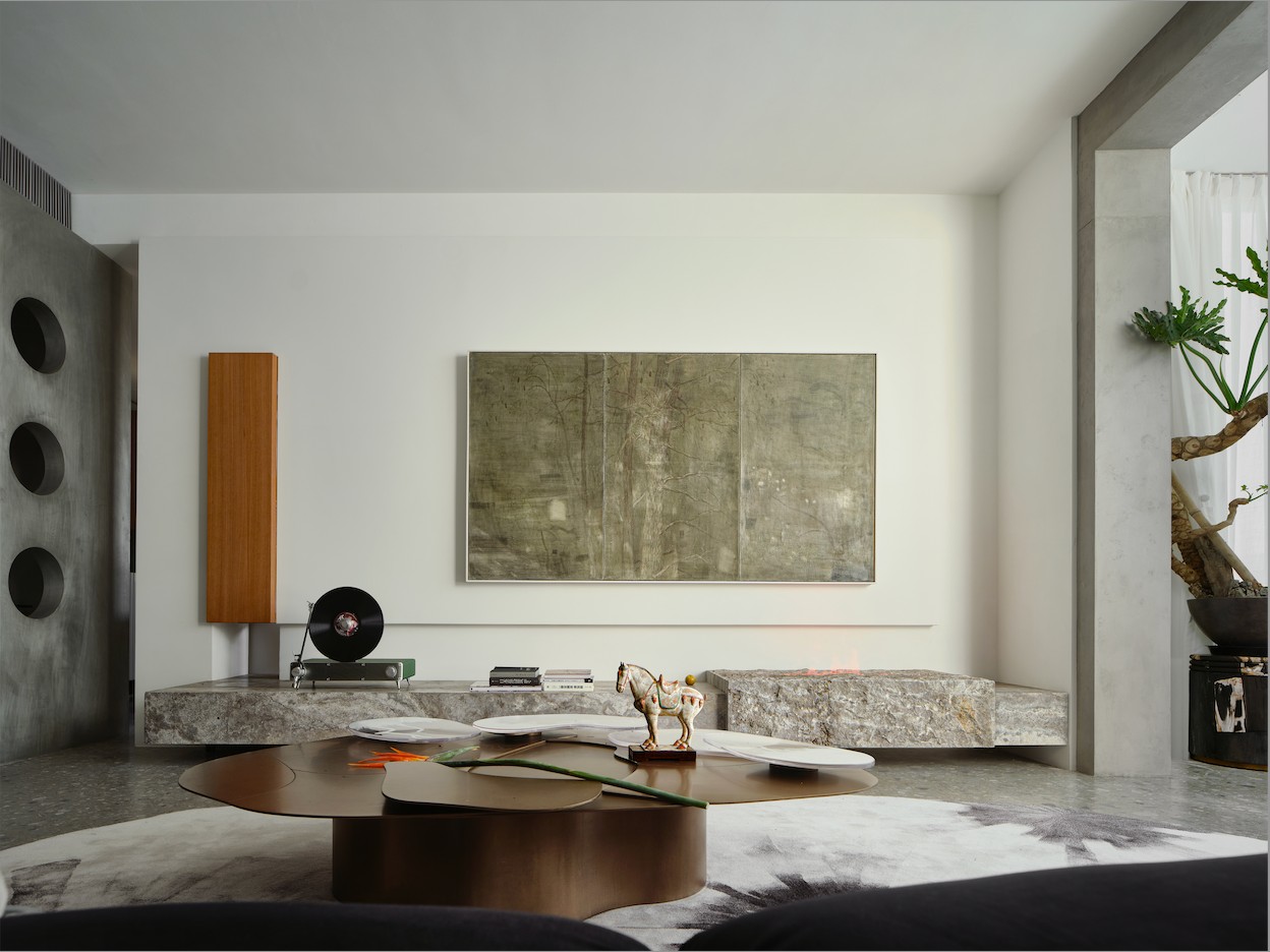 石材的语言亦延续至室内,从地面、厨房岛台、浴缸乃至书架,无不统一于坚实冷峻的质感中。与之形成对比的是大面积开窗与半露台空间,确保室内始终与自然保持感知联通。木材的运用更为细腻,从立面延伸至厨房、地面与衣帽间,贯穿内外,赋予住宅温润的触感与连续的秩序。