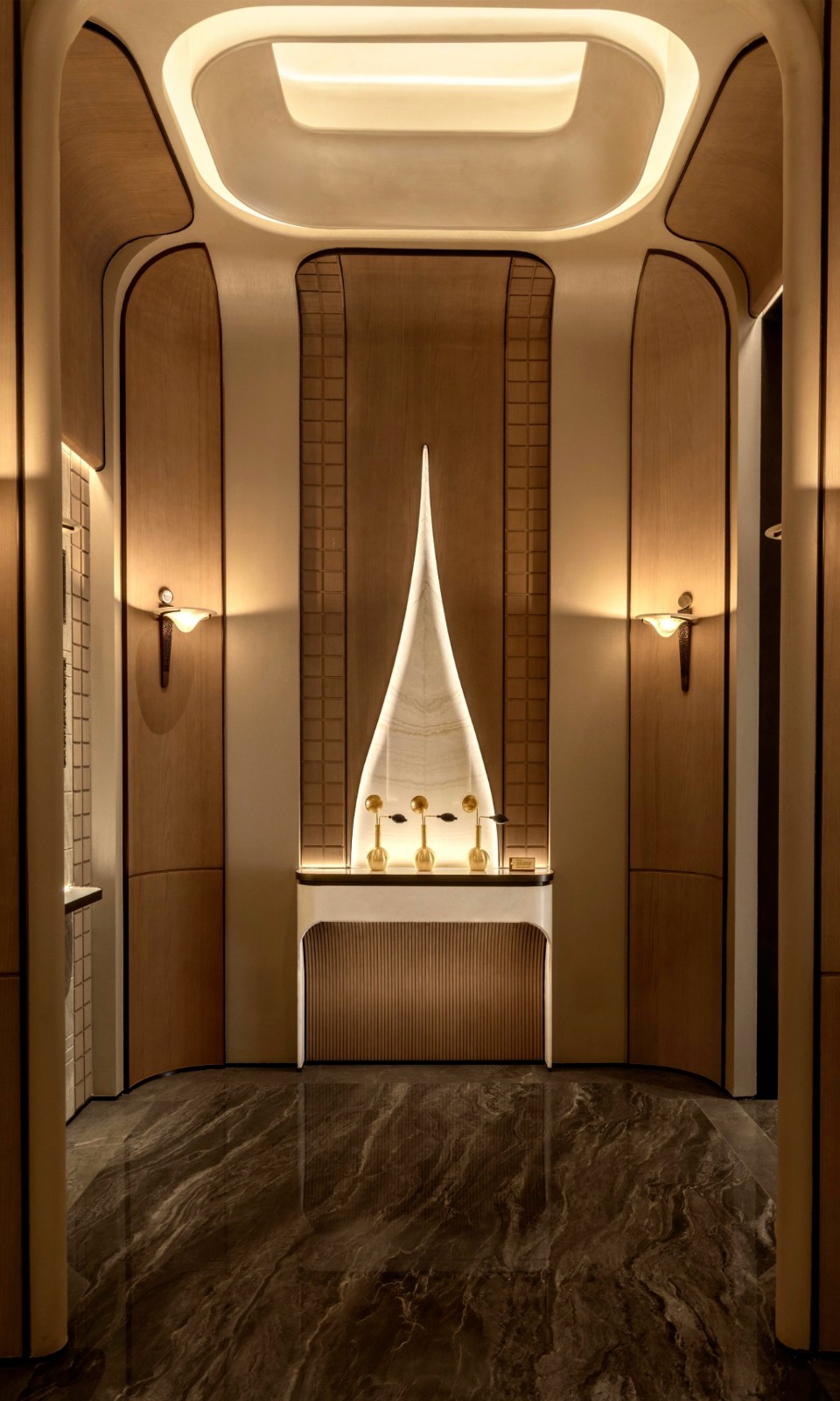 拱形顶化解原建筑梁体,兼具结构美学与实用功能。线性天际灯沿弧面延伸,漫射光线均匀洒落,使客餐厅过渡区既保持动线流畅,又营造出独特的艺术光感。设计将结构难题转化为空间亮点,实现功能与美学的双重提升。