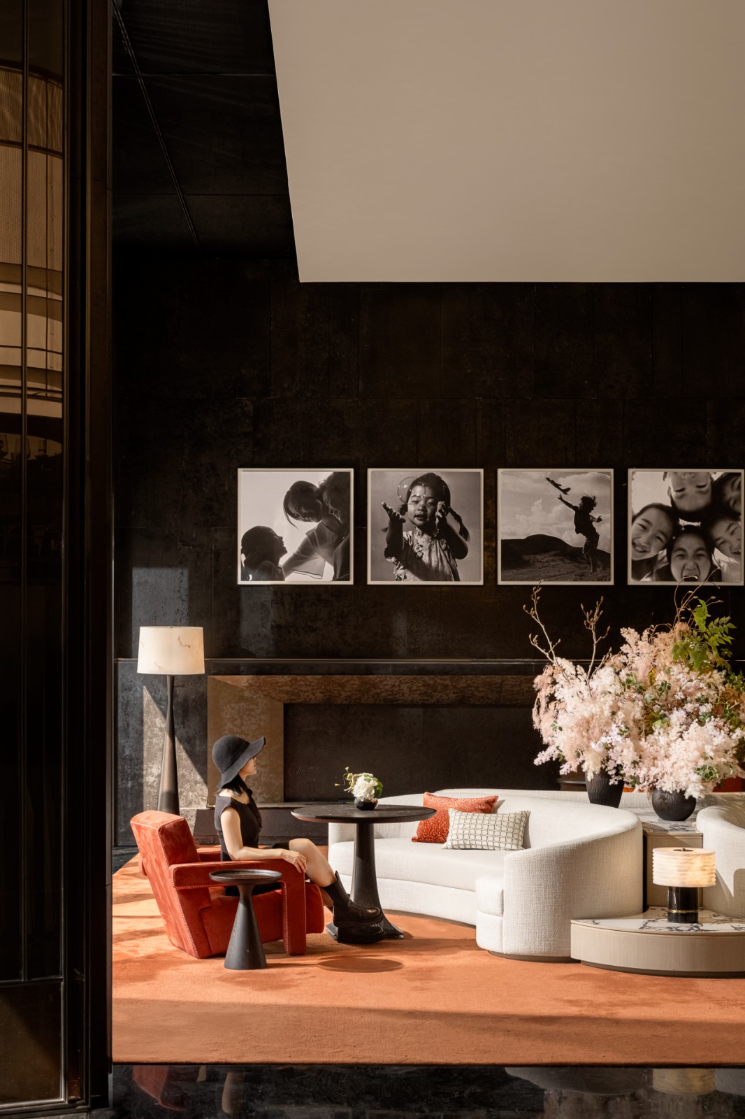 艺术屏风整齐列阵,将自然光线解构为几何光轨,对应地面黑白格大理石,场域的进出便成为穿越光影隧道的艺术行为。