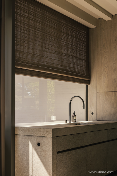 在住宅中,木材从建筑外部覆层自然延伸至内部厨房台面、地板及更衣室,形成一条被设计师称为“温暖痕迹”的连续材料叙事。这种设计不仅将外部的自然质感引入室内,更通过统一的材料语言弥合了公共与私密、外部与内部的概念界限,营造出既根植于环境又流畅舒展的无缝体验。