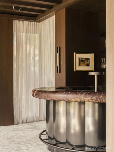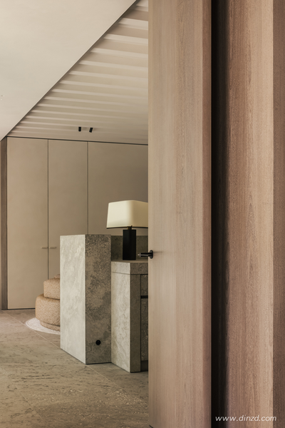 VC住宅(VC. House)的室内空间以天然石材作为主导材料,其应用远超出结构范畴,从地板、厨房岛台延伸至浴室与书房,形成统一不同功能区域的核心元素。客厅陈列着埃尔文·沃姆(Erwin Wurm)的雕塑与一幅《艺术与语言》(Art - Language)画作,后者描绘了纽约前惠特尼博物馆的野兽派建筑室内风格。