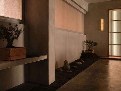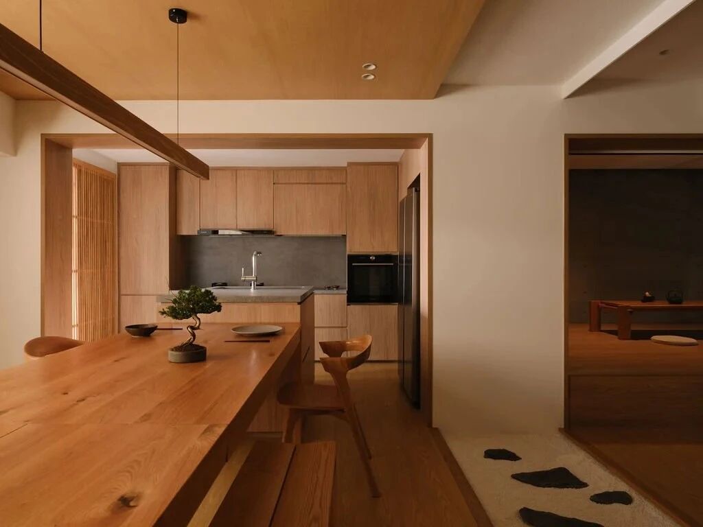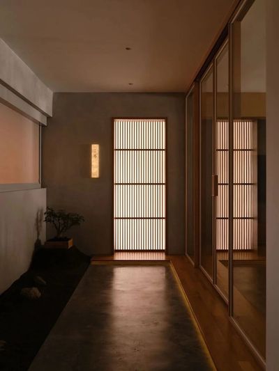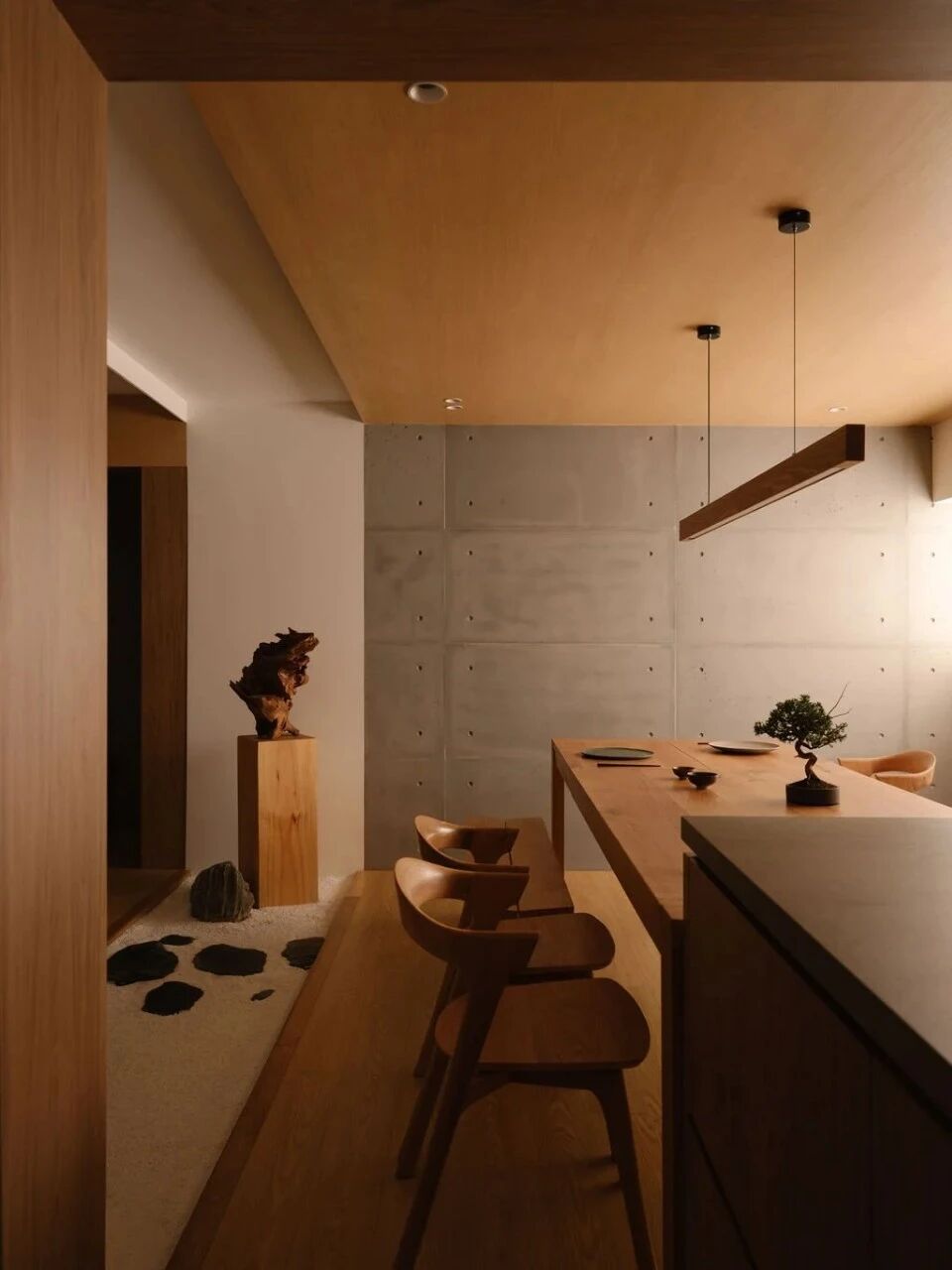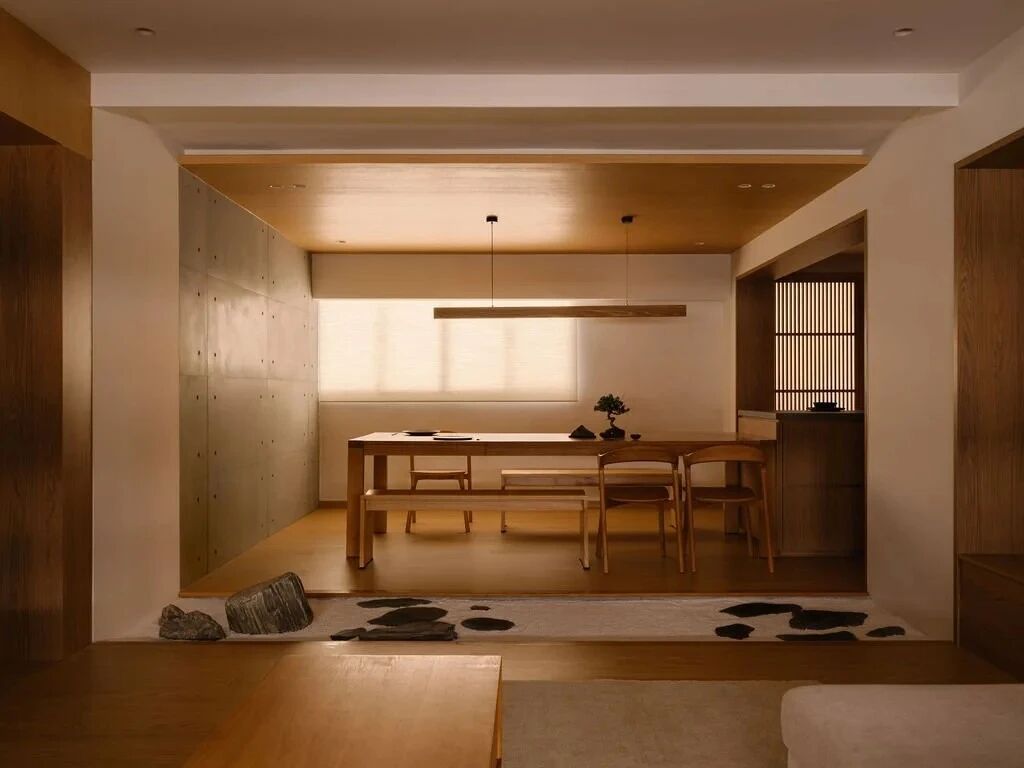 Upon entering the residence, the first thing that greets visitors is the reinterpreted Genkan entrance hall. This space is floored with pebbles and decorated with bonsai, serving both as a functional buffer zone and a psychological transition. It inherits the traditional Japanese sense of ritual order, but in the context of modern residences, it has been given a new interpretation, becoming an important boundary point between the external hustle and bustle and the indoor tranquility.