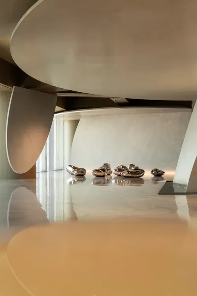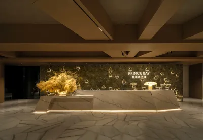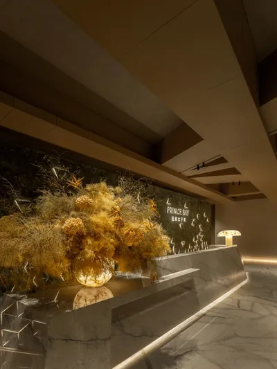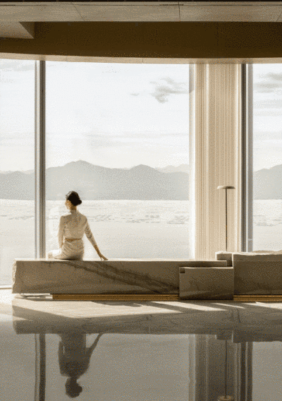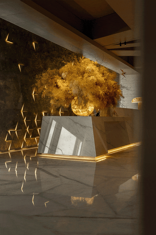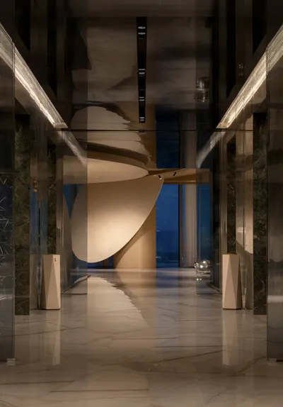 材质由冷至暖,从石材地坪的克制质感,过渡到木饰的温柔包裹,每一次步伐的落地,都是一次由理性走向感性的转场。艺术装置取形于海流与风痕,轻盈地悬浮在挑高空间之中,既具雕塑的体量张力,又不失对自然节律的敬意。