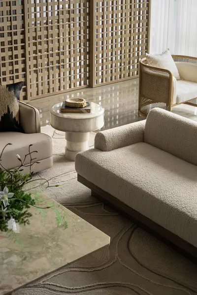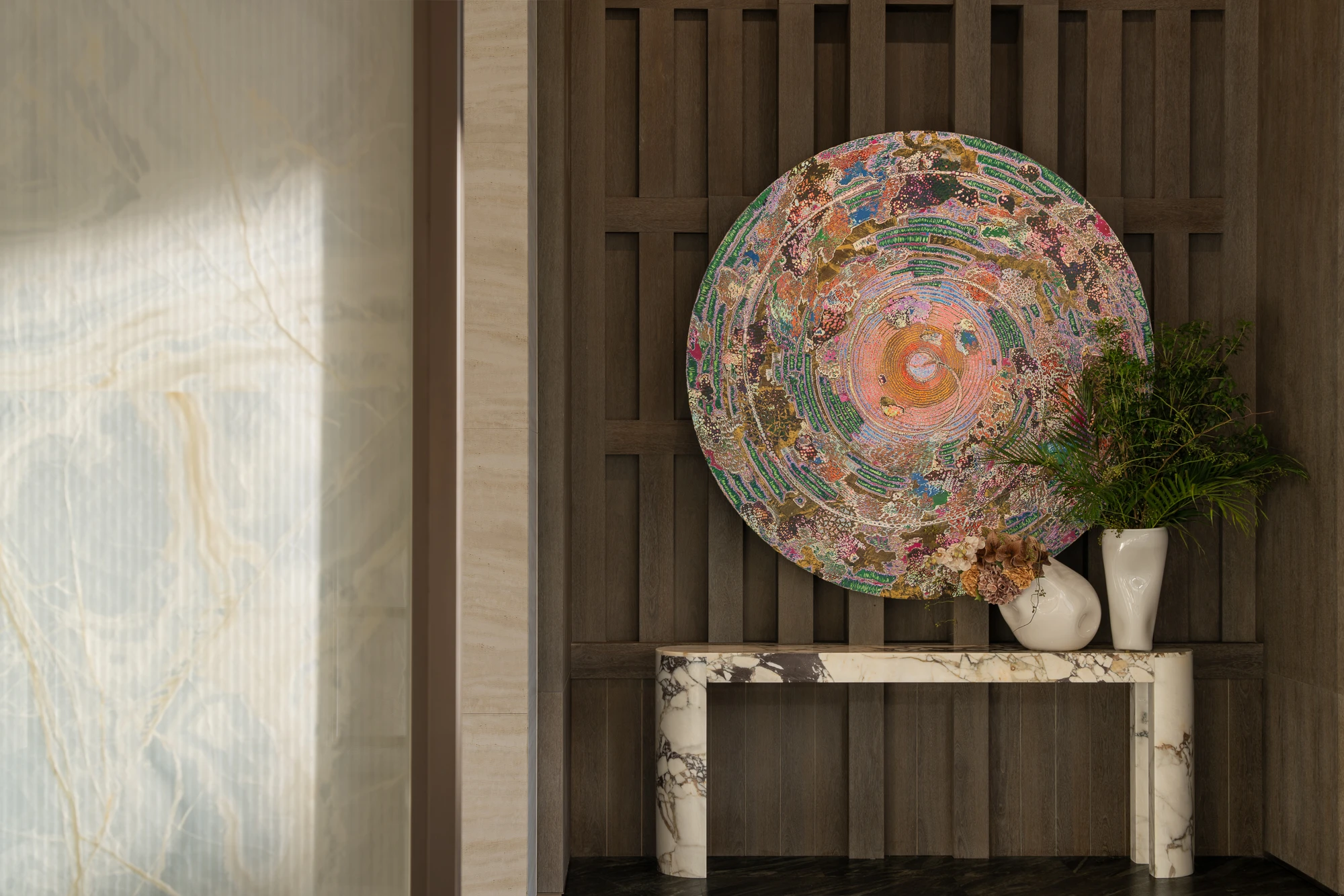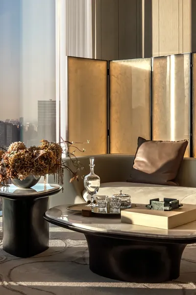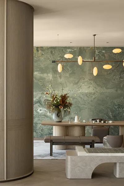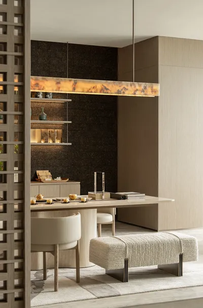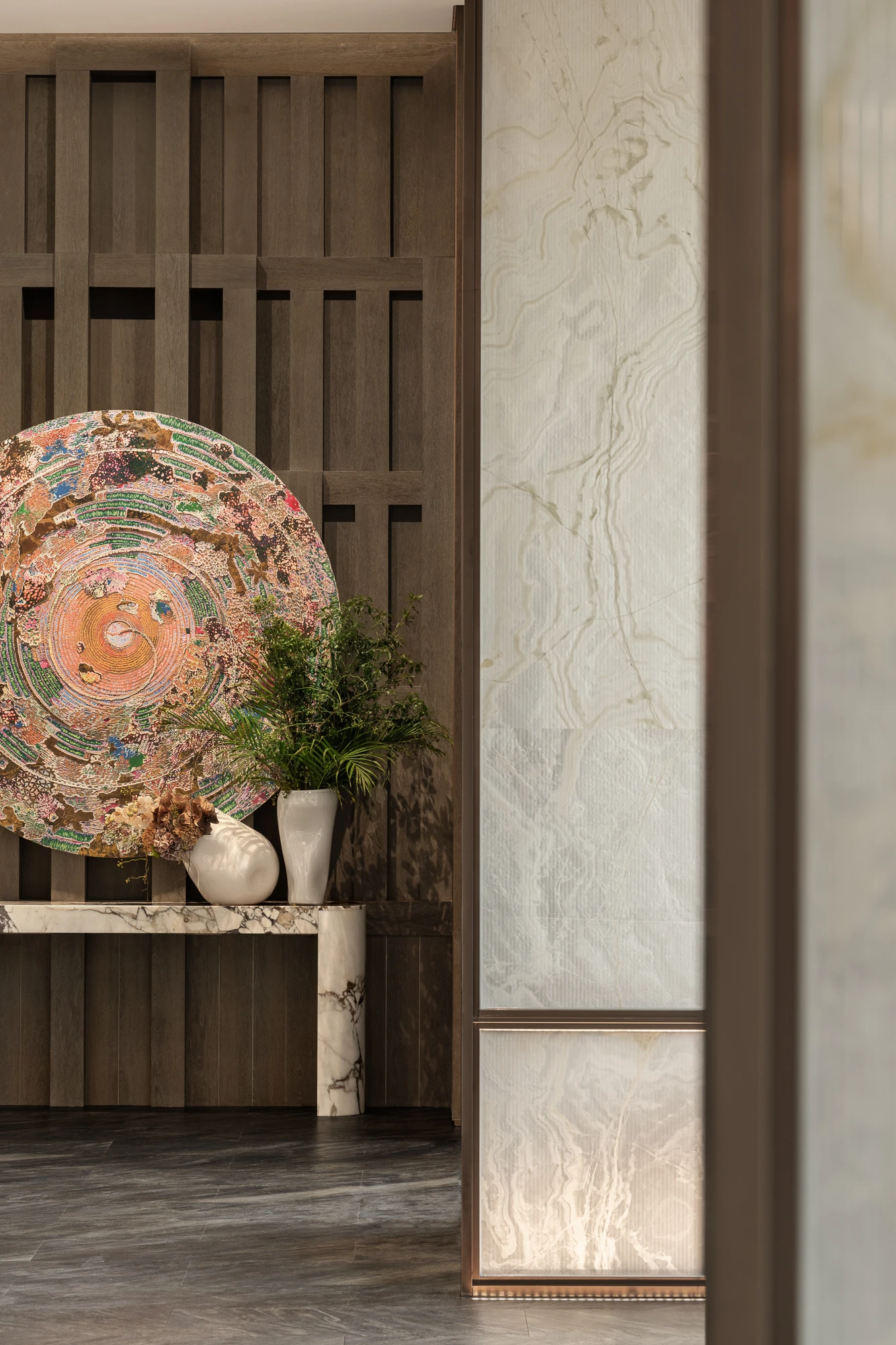 空间因之而有了骨感与魂感,不同色温的石材与木饰、金属、织物发生微妙化学反应,让奢华不再显性张扬,而是一种含蓄、隐匿、深层的在场感。