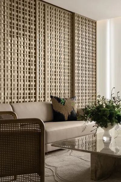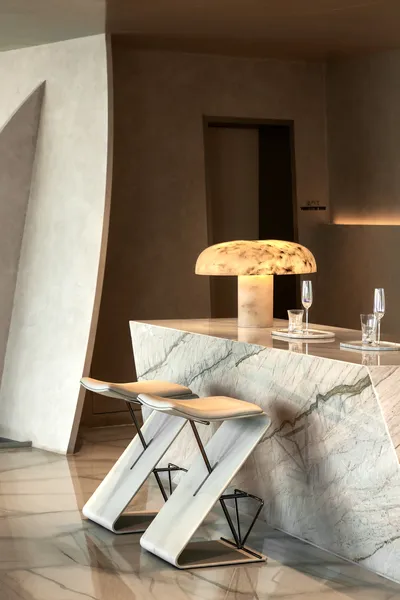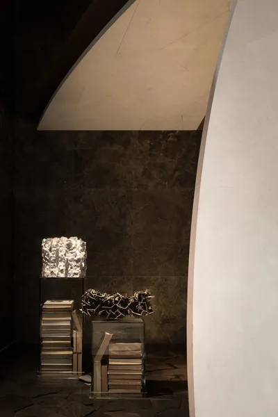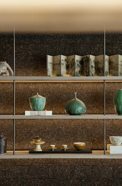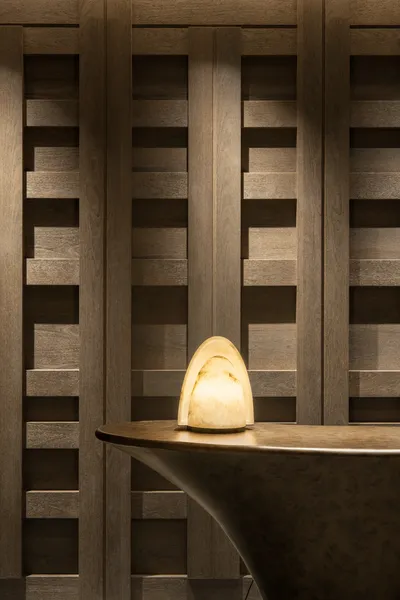 茶室以通透的布局隐匿出私密的气息,宛若一处为少数知己预留的静心之所。空间素雅而东方,兼具现代克制的语汇。壁灯以宏阔的姿态嵌入墙面,光影层叠,仿佛将时光的静谧凝结。