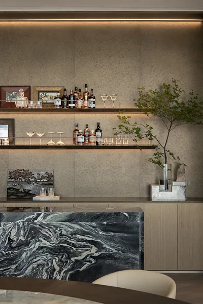 水吧以中轴之姿立于空间核心,深色基调在轻盈的氛围中沉淀厚重感,如同城市精致生活的静默底色。绿植在光影中轻摇,微风般的律动使空间在厚重与灵动之间找到平衡。