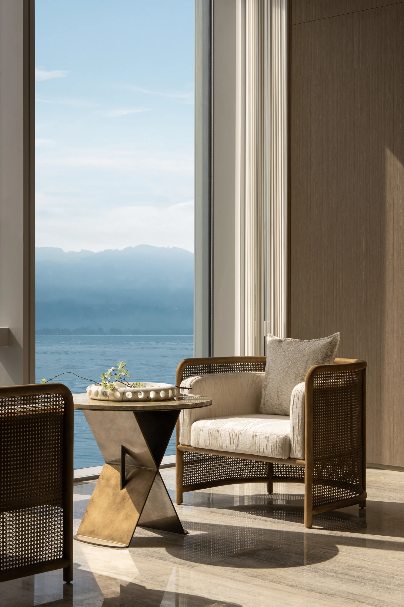 古铜色家具以简洁的线条铺叙空间的秩序,不以繁饰取悦,而以内敛的光泽与质感回应大海的深沉与从容。此处的设计,不是将自然装点为风景,而是让建筑与自然共生,使奢华在松弛中见克制,于简练中见尊贵。