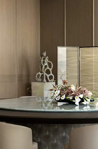 素雅的艺术花瓶错落其间,如笔墨留白般平衡虚与实,营造出含蓄的格调。家具造型则以简练线条取胜,不追求繁饰,而以比例与尺度呈现出理性的秩序与温润的情感,使整个茶室成为礼与雅、虚与实之间的精神栖居。