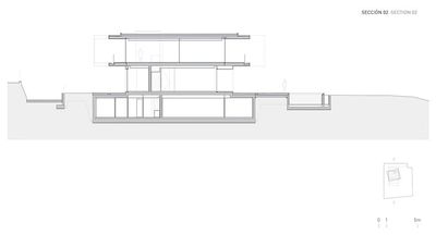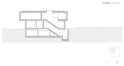 每个体量的两侧为厚重的承重墙,另两侧则完全敞开,从而便于采光、通风与南北向的交叉通风。交通核心横向布置,将与高处邻居相邻的后侧划分为相对更具公共性的区域。