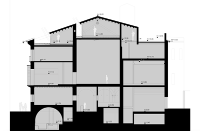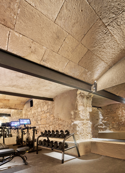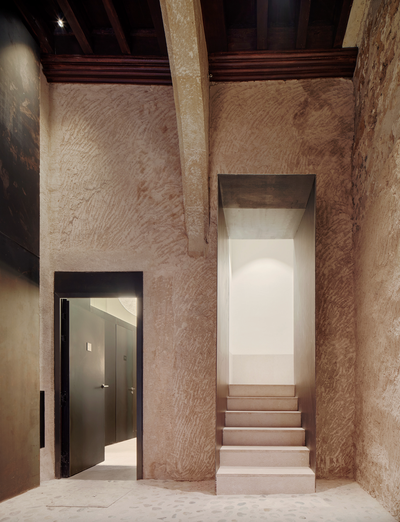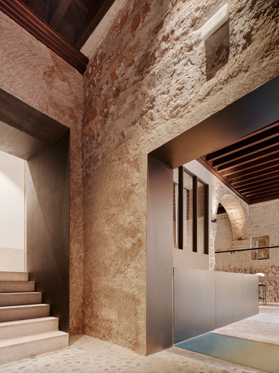 翻新过程中引入的新建筑元素 —— 包括室内隔断和楼梯 —— 均采用黑色钢材建造,与修复后的石材和灰泥表面形成鲜明视觉对比。这些新元素进一步凸显了石质结构的厚重感,同时其灵活性也使得未来在不损害历史完整性的前提下进行适应性改造成为可能。