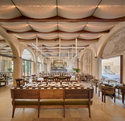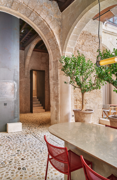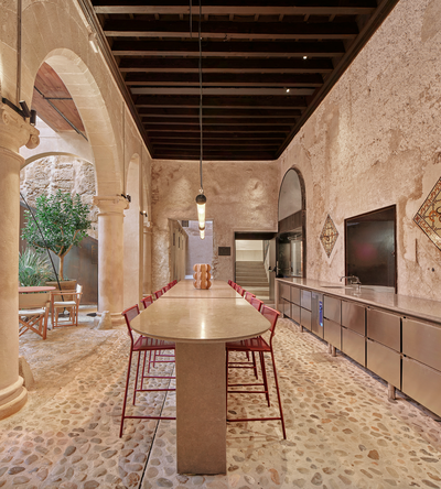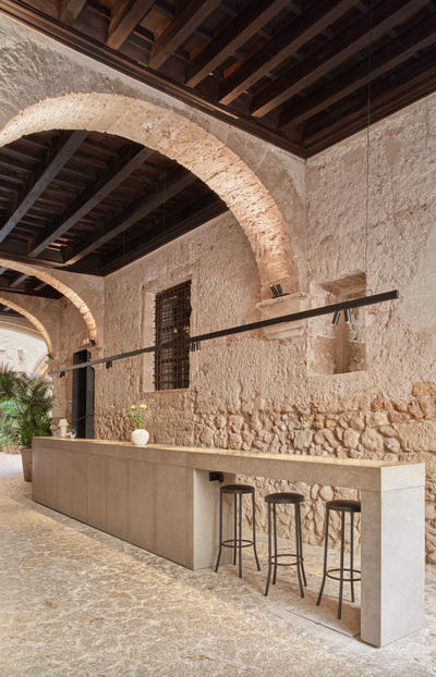 诺比斯帕尔马酒店的翻新始于详尽的建筑测绘,记录了这座马略卡岛建筑漫长演变过程中的种种痕迹 —— 拱形门洞、被封堵的窗户以及层层叠加的立面。设计团队并未掩盖这些历史痕迹,而是将其展现出来。在餐厅区域,20 世纪 50 年代的改造痕迹与原始墙面得以共存。