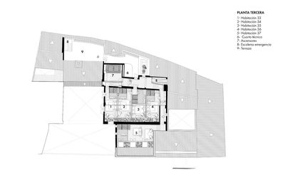 诺比斯帕尔马酒店独特的阁楼空间,通常依赖天窗采光,而此次改造则通过在屋顶开设露天庭院来重新引入光线。这些花园空间既引入了自然光和植被,又避免了马略卡岛过度的太阳热。在整个建筑中,任何新的改造都设计为可逆的,且与原始结构清晰可辨。