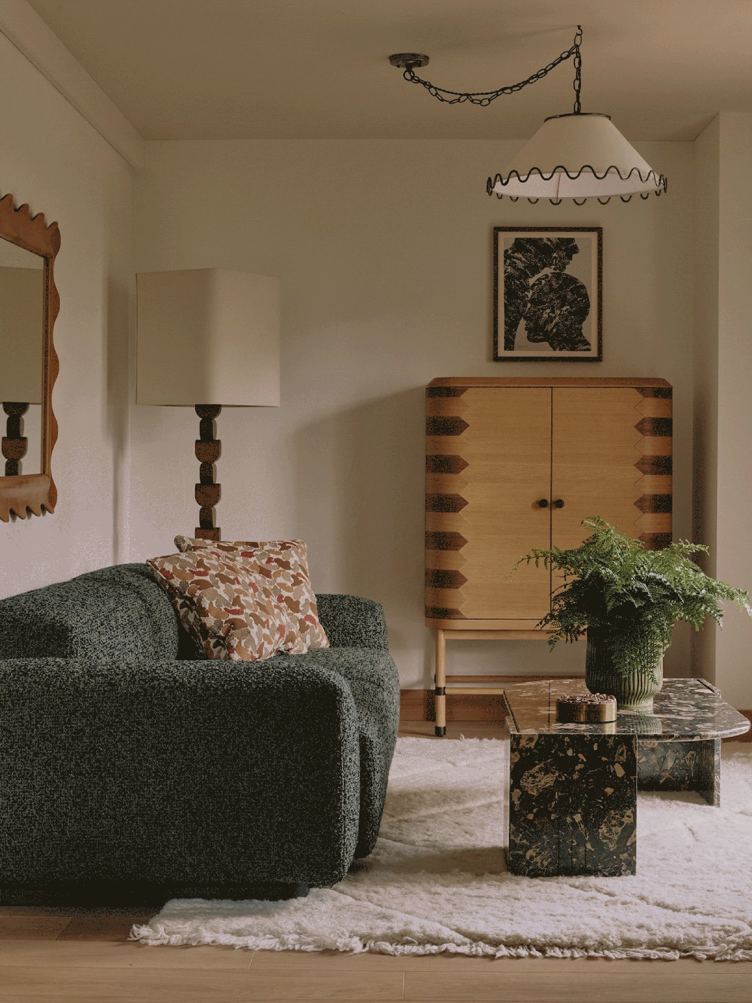 洽谈区以细节呈现品质,定制家具赋予空间尊贵感与专属体验。波纹地毯与天然石材地面柔和过渡,与艺术屏风形成巧妙联动。