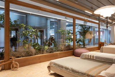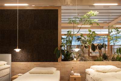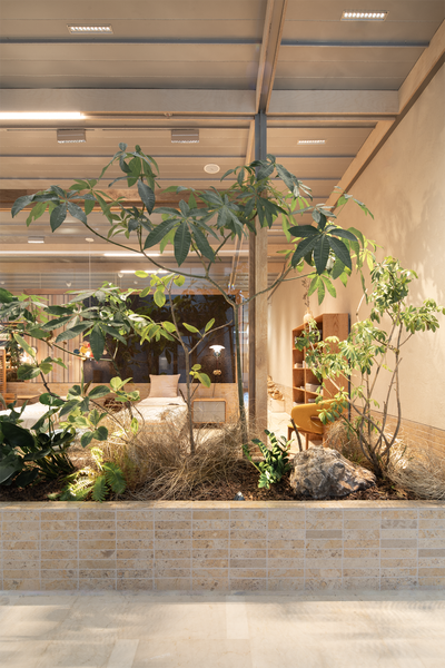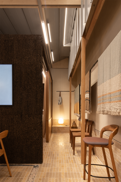 In terms of material selection, the design incorporates cork, limestone, natural textured paint, oak wood, and other elements to embody the brands "rooted in nature" philosophy.
