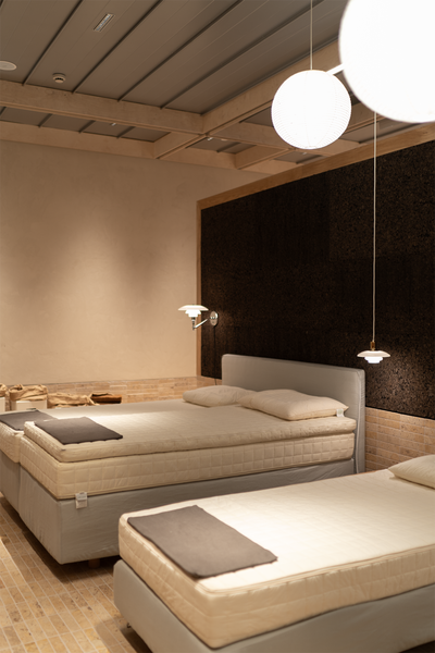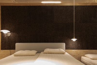 空间内的深色软木盒子是置入空间中的独立深度睡眠区,室内采用可变化的智能灯光系统,模拟家庭卧室深度睡眠体验。