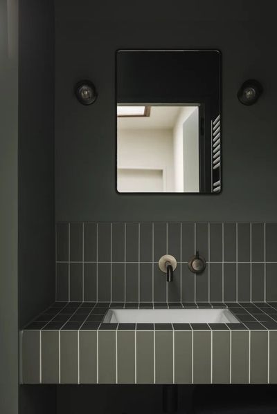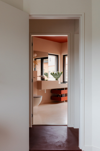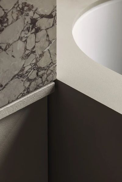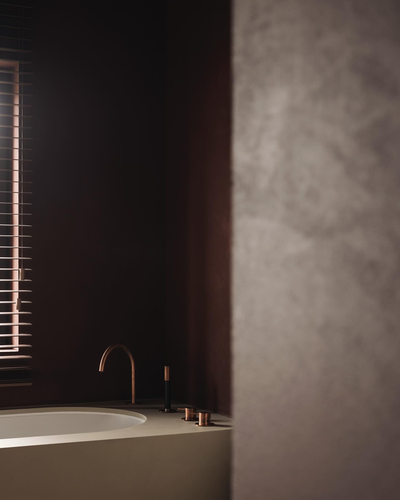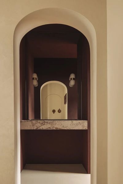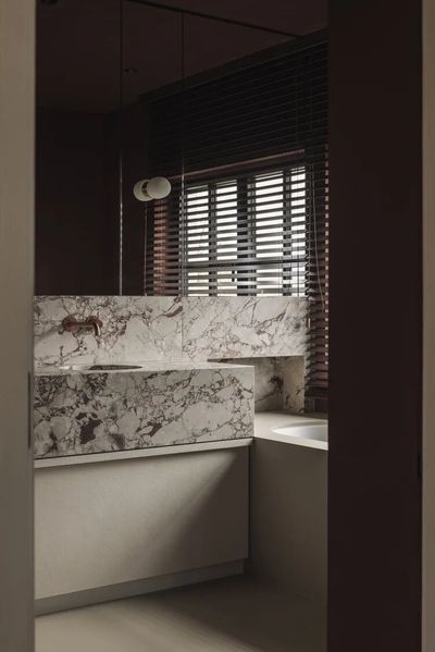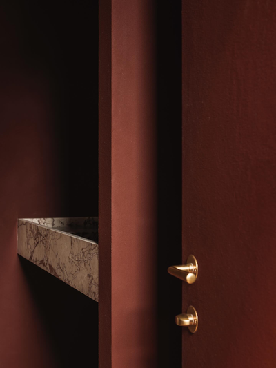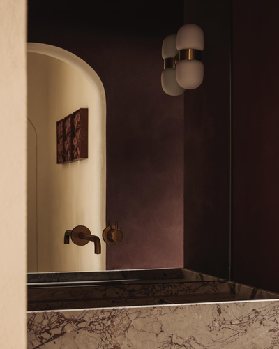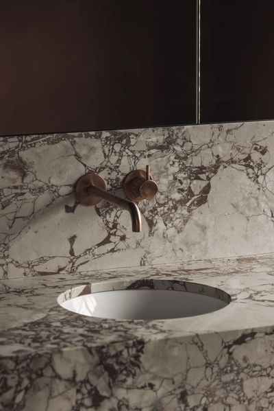 Breccia Rose 石材和铜,以及暗红色墙面的搭配,是一个非常大胆且极具戏剧性的选择。这种搭配摒弃了传统卫生间的保守色调,旨在创造一个优雅、戏剧化且充满情感深度的独特空间。