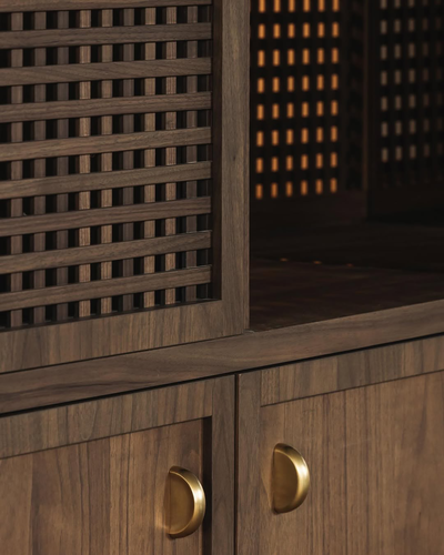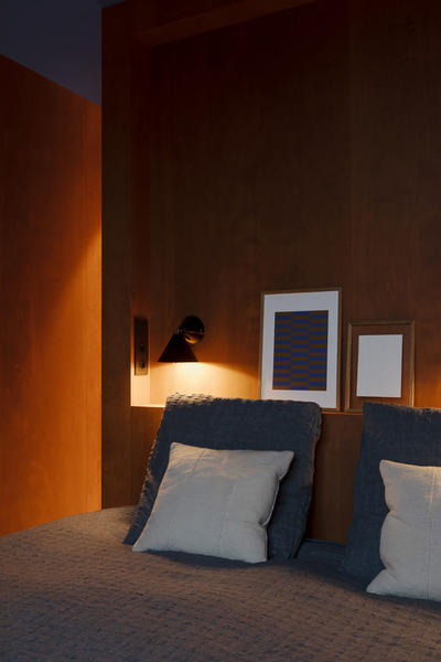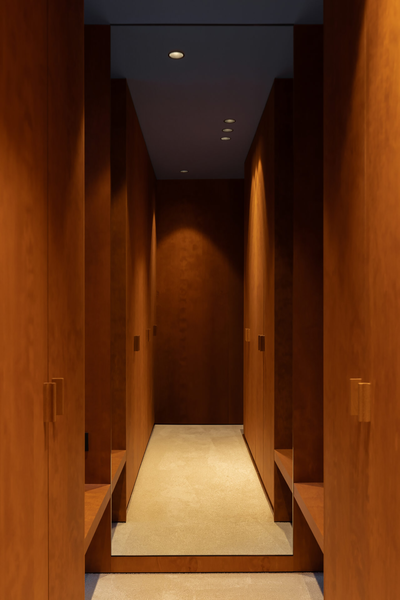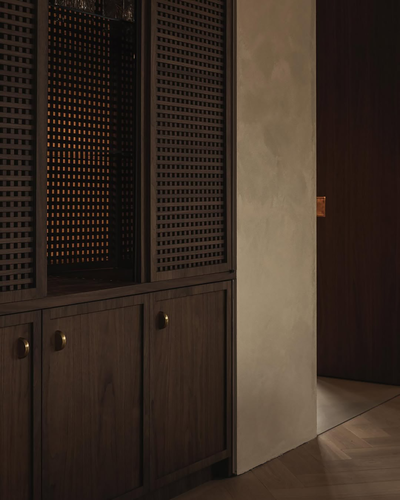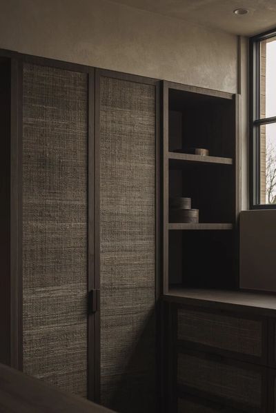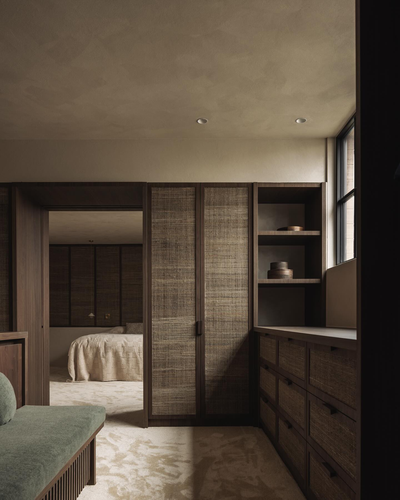 拉菲草编织元素则为主卧和更衣室增添了自然柔和的氛围,木材的温润纹理与编织的有机肌理,仿佛把自然搬进了室内。交错的元素结构源自于古老的手工艺,充满了原始的生命力和质朴气息。