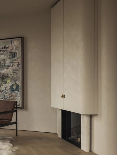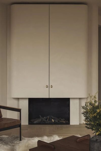 舒适而现代的壁炉与起居空间完美融合,圆润的边角增添了一丝柔和的质感,而隐藏在一体式门后的电视则保持了整体设计的简洁和低调。