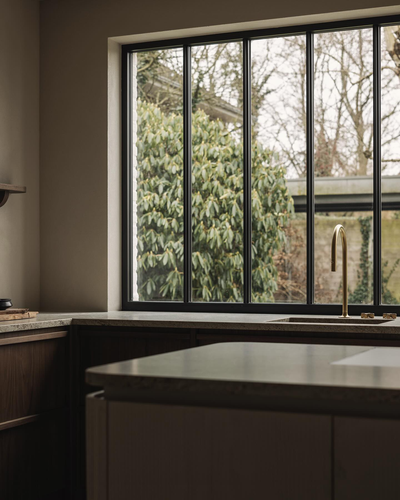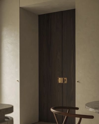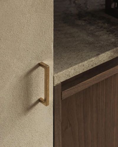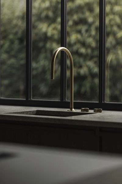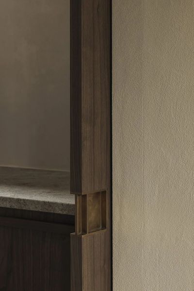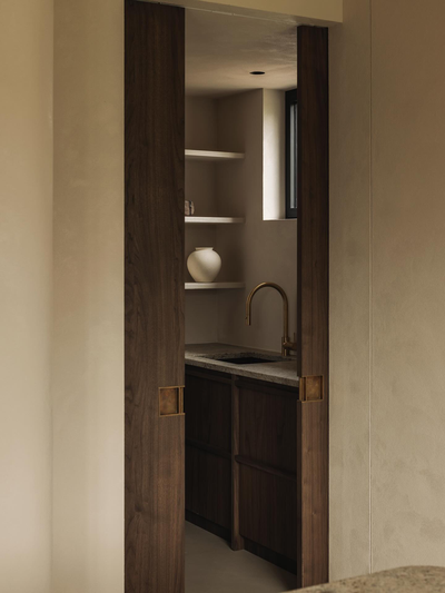 一体式咖啡角和空间的其他部分形成无缝的视觉效果,拉丝黄铜水龙头和带台下式灶台,兼具美观与舒适。