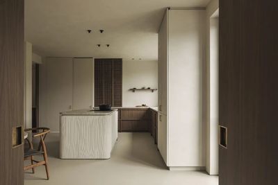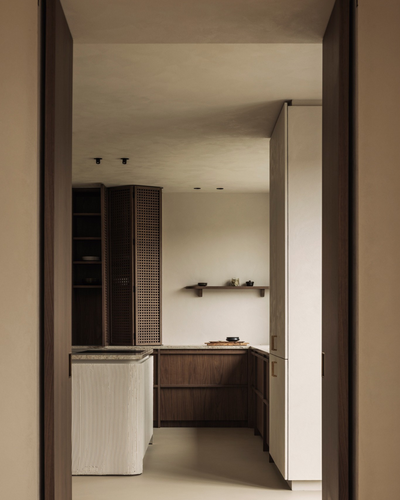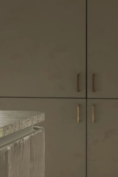 房间以暖米色为背景,搭配纹理圆润的台面和固定胡桃木家具,黄铜细节点缀,使室内空间更加明亮。