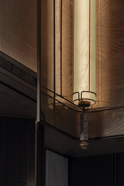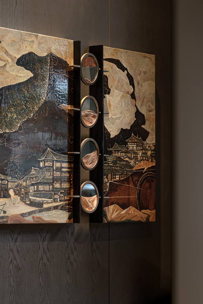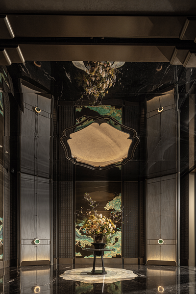穹顶延续「千里江山图」脉络展开,灯影流转间,山形水意投映四壁,恍见月下峰峦游走,暗藏乾坤韵律。