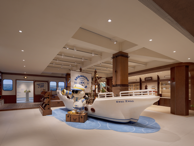温和从容的弧面,将各式陈列柜包裹于空间之内,塑造室内的流动感,强化具有航海叙事的空间骨架。同时为了契合年轻世代更需情感共鸣、情绪价值等消费趋向,场景视觉锚点以货轮相关元素融合轻量化道具,缔造塑造海上市集的热闹与活力。