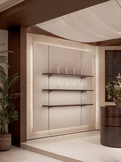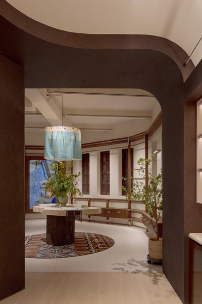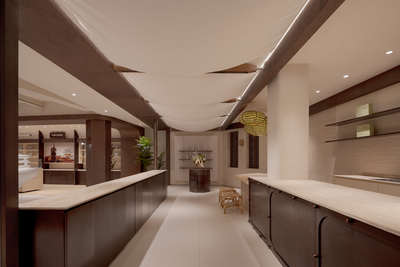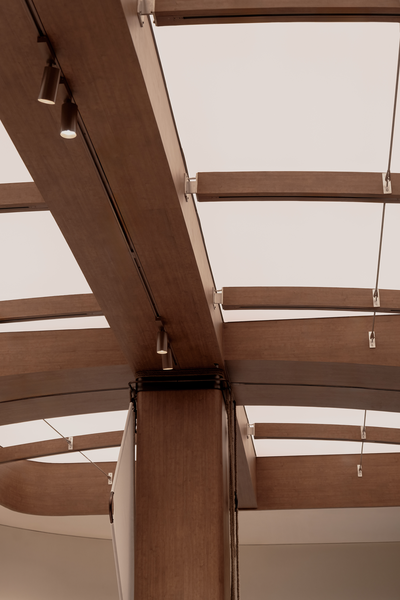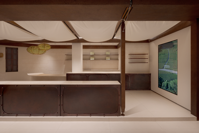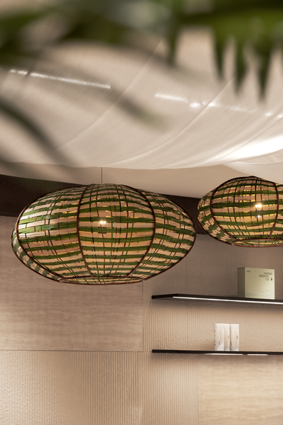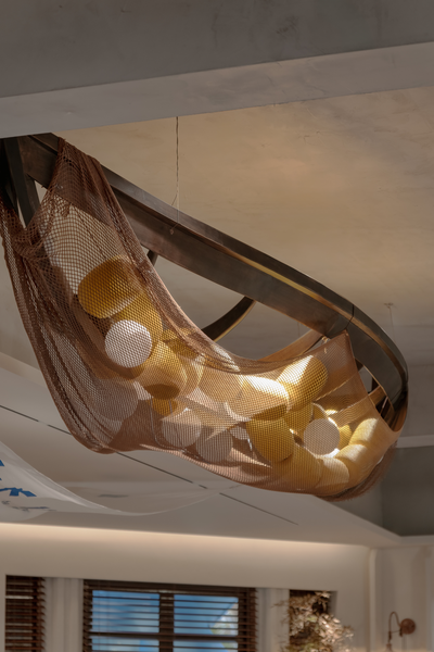 茶区则以克制而凝练的线条与沉静的色彩,让人抵达内心的宁静。圆润的弧形贯穿于模拟船帆结构的穹顶与灯笼般的藤编灯具,给予温柔包裹的安定力量,邀请客人静谧品鉴洽谈。