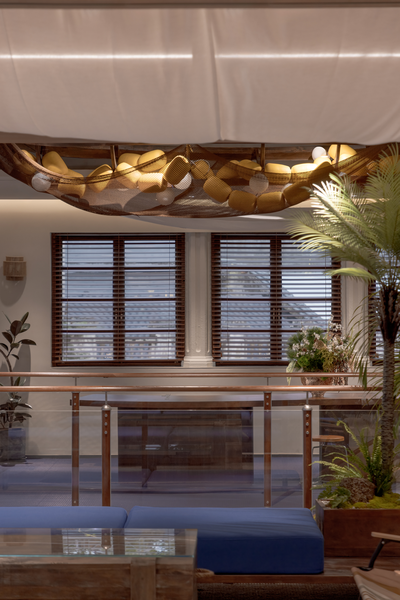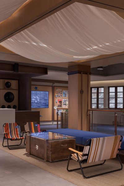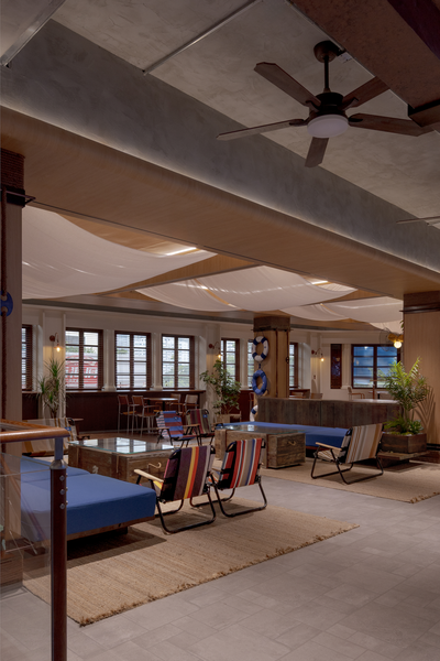 由天花板向下垂挂悬浮的白色布帘,有意同频于日光下,在海上甲板松弛社交的生活场景,其轻盈的质感让人自然联想风帆的形状,随着货轮开启浪漫征途。当逐层登船,空间带来更缓慢宁静的度假气息。当入坐放松身心的休憩躺椅,身侧是冲浪板、游泳圈等海洋运动装置,你可以透过货箱遥望航海旅程,共处热带阔叶植物,感受假日时光的惬意与舒适。