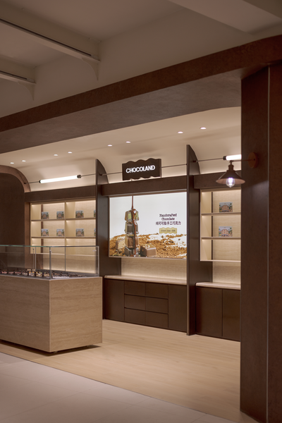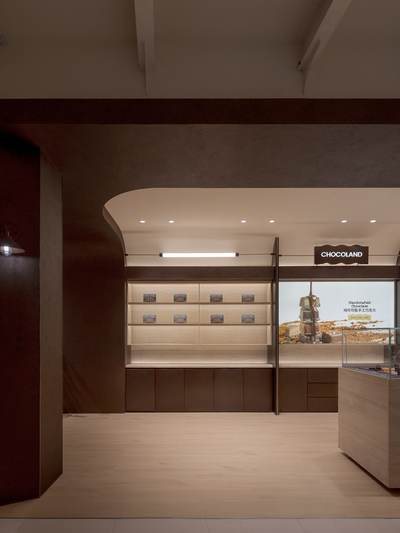 巧克力区框架色彩提取深棕色与浅咖色包裹形成内外层次,给予视觉与功能层面的顺滑自如。富有流动感的空间结合怡人的色调组合,引领客人进入甜蜜的小“食”光。