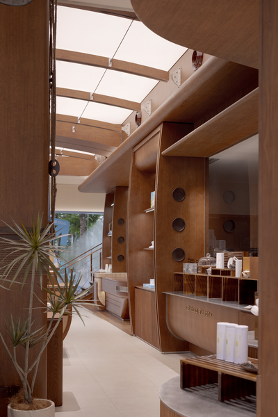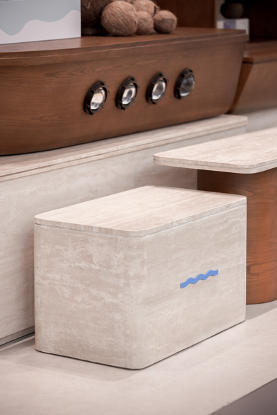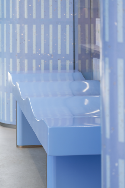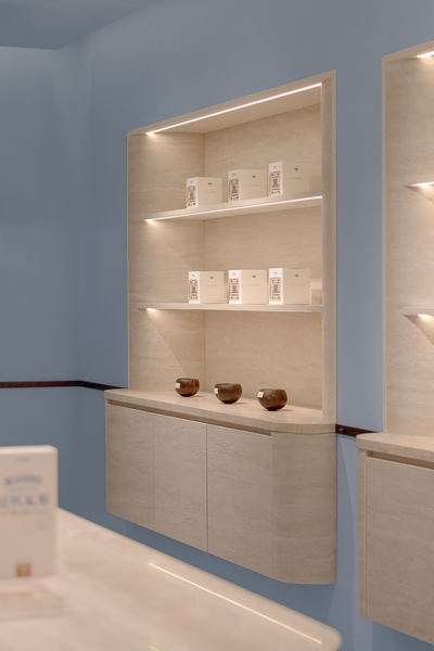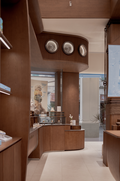不同分区契合不同产品类型,在场景塑造与空间感受上有差异性。香薰区的浅调蓝白,展现触碰海底世界般的静谧与澄澈。空间色调变化,也暗示着场景的转换——进入船舱里的安定从容。空间契合香薰产品的治愈力量,将人的情绪调控至安静中,投入感受不同香氛的气味。