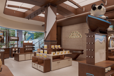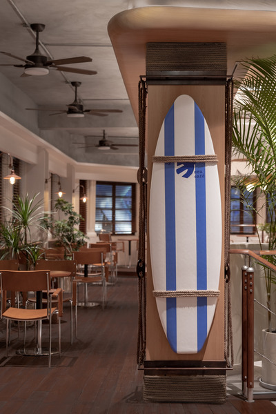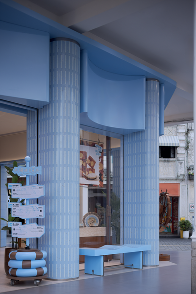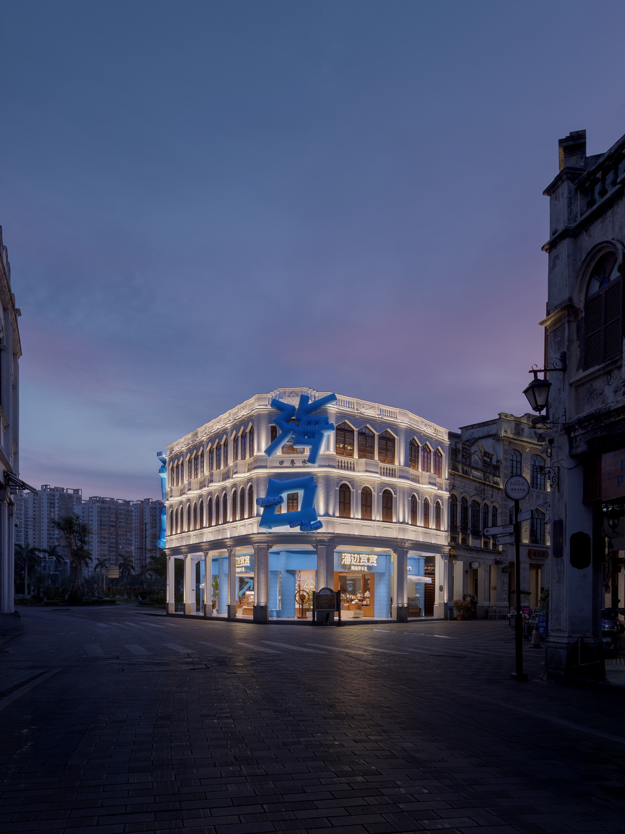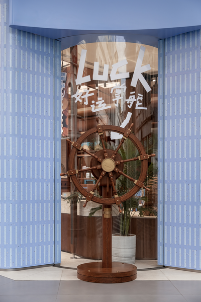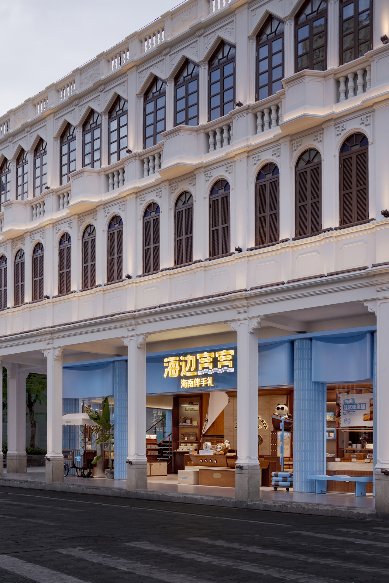「海边宽宽」海口水巷口店,择址一栋百年历史骑楼建筑,永创设计于海口历史文脉里提炼以“船”为核心概念、“航海”为核心叙事的设计理念,注入来自海、浪、风、沙里的自由与热烈,碰撞大海的蔚蓝与船舱的暖棕木色,衍生丰富船舱设计细节与海上生活场景,回溯令人向往的航海之旅。并在建筑内外设置多处打卡装置与惊喜彩蛋,期望塑造海南文化旅游的新晋打卡地与传播地,以新旧共生的创意场景去焕新老街生命力。