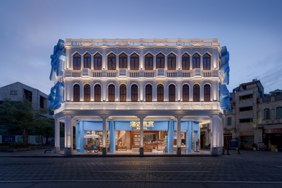 建筑外立面在保留原有骑楼建筑结构上进行翻新与创新演绎。首层作为激发人流进出的重点空间,设置双入口最大化打开空间,以海浪意象定制异形曲面门头与休憩座椅,塑造流动感与昭示性。