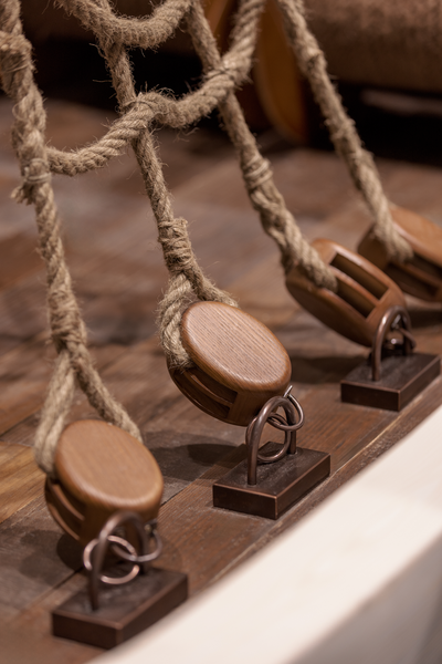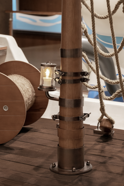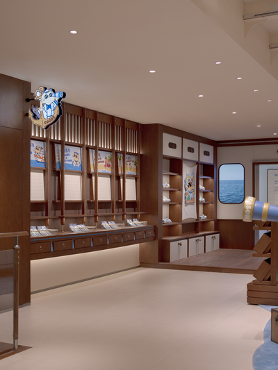 设计以老船木仿制构件,定制适用于不同产品的不同造型货架,增添空间的视觉层次与新奇体验。将提取自“船”的丰富元素融入场景装置,吸引客人驻足探索、打卡与传播,沉浸感受航海主题叙事。