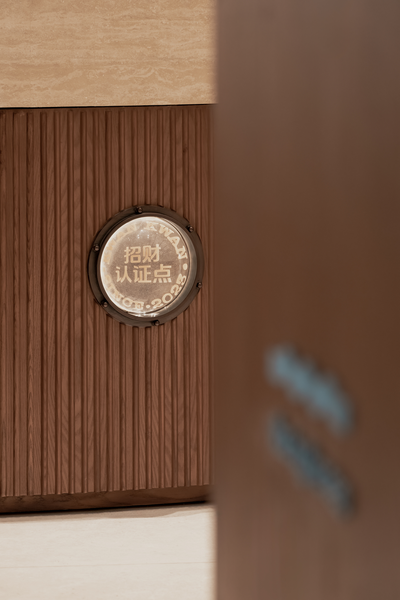 文创区以阵列与对称等重复性的设计语言,构建人们内心如海面般安定平和的秩序。一旁墙面模拟舱井以LED屏展示涌动的海景,看得见“窗外的海面”设计,延展空间的辽阔度,释放更多想象力。